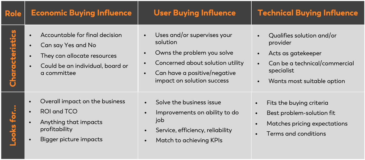 Categorising Buyers into decision-making roles helps determine who you should approach first and, what they are looking for as we show in the table below. This example is extracted from Miller Heiman’s Strategic Selling methodology and is a good example of well-defined decision-making roles.